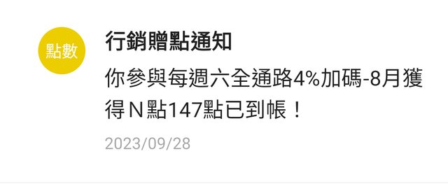 8月份每週六全通路4%加碼的活動,同樣準時於今28日入帳,有消費的可以檢查看看。