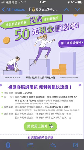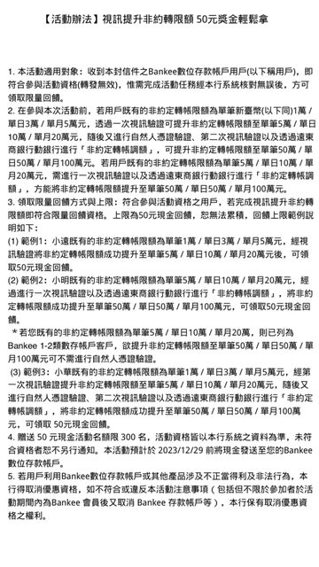 標題[情報] 遠銀bankee視訊調非約轉限額得50元現金回