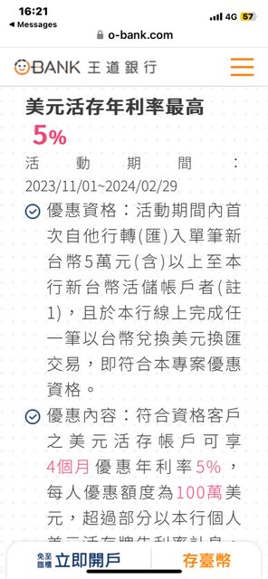 推 PitzMan: 他應該是換匯一筆不限金額的,就能存100萬美元以內的5% 11/28 19:36