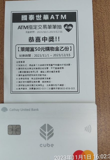 → operatorm: 以前開的,國泰超大方,1人7帳7金融卡,50*7無卡提全復活 12/02 06:00
