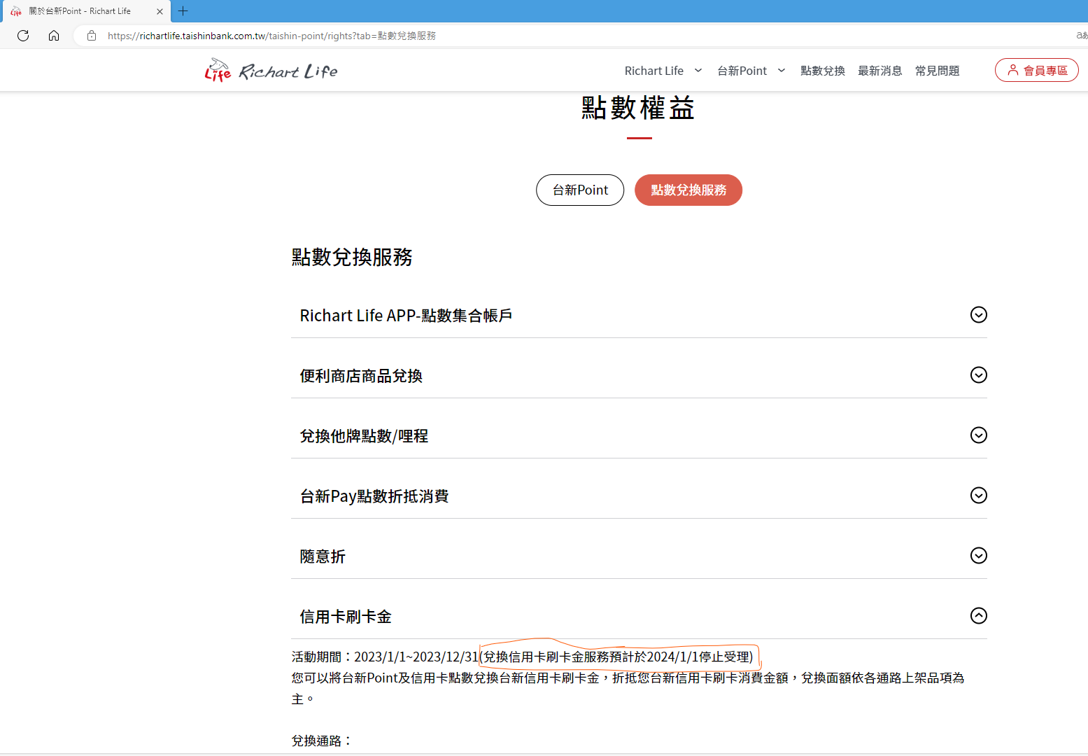 → TZUYIC: 2024/01/01到了,台新Point直接兌換刷卡金項目準時下架。 01/01 12:46