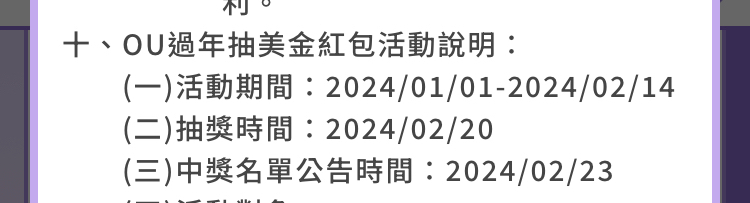 2024/01/01-2024/02/14 前新辦OU數位存款者符合抽獎資格