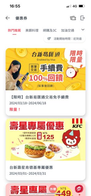 在台新行動銀行看到跨國提款免手續費的優惠券。