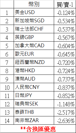 我知道在臺灣銀行美元是匯差成本最小的幣別,那麽除了美元之外,想請教匯差成本最小的