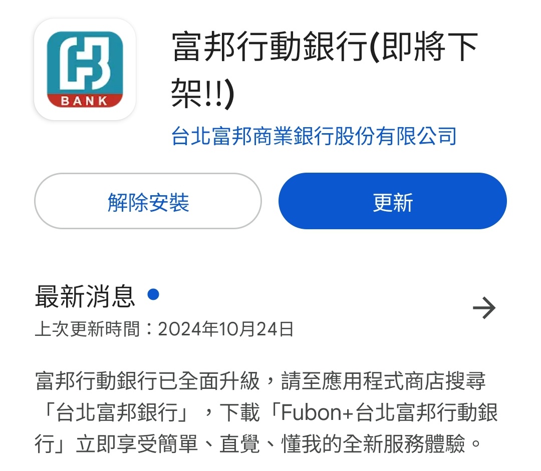 alex1973: 我的 Play Store 搜尋 "Fubon+" 出來的是富邦香港的行動10/23 11:09