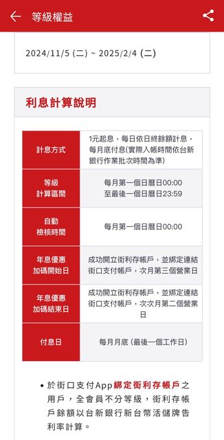 : 全會員不分等級,街利存帳戶餘額以台新銀行新台幣活儲牌告利率計算(目前是0.725%