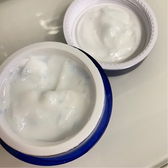 質地比較像是水凝霜,裡面含有高濃度維他命原B5、玻尿酸精華,比較特別的是藍色小顆