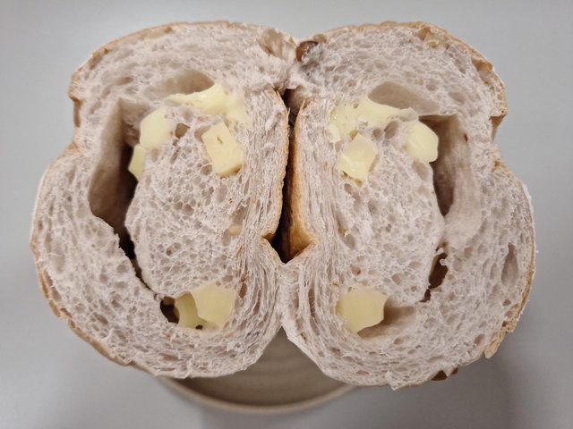 這次小七新品當中 推出了兩款感覺比較有質感的兩款大麵包 因為另外一款有我不敢吃的東西 所以就只買這款 乳酪核桃軟歐 45元 如果是以一般超商麵包來說算偏貴 不過這個還蠻大一個 而且拿起來有點沉甸甸 看包裝上寫著是淨重180公克 表面上佈滿了核桃 切開來看 裡面有很多乳酪塊 麵包口感也是很有嚼勁的歐式麵包 不會乾巴巴 算是很接近什麼馬克先生之類的歐式麵包 個人覺得以這個價格來說還算可以 另外一款玫香草莓乳酪軟歐 就看有沒有人吃過了 ================================ -- ※ 發信站: 批踢踢實業坊(ptt-web.org.tw), 來自: 59.124.3.1 (臺灣) ※ 文章網址: https://ptt-web.org.tw/CVS/M.1694028602.A.141