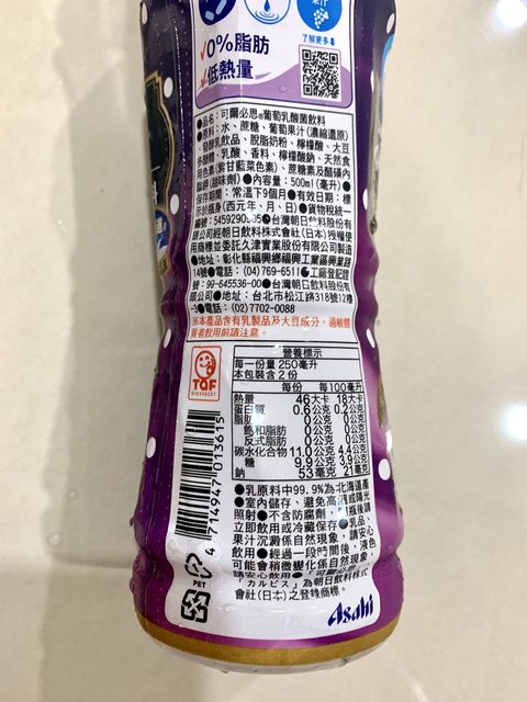 【商品名稱/價格】:可爾必思 葡萄乳酸菌飲料 / $29 【便利商店/廠商名稱】:全家 【規格/內容物/熱量】:500ml https://i.imgur.com/5ai1NSD.jpg
