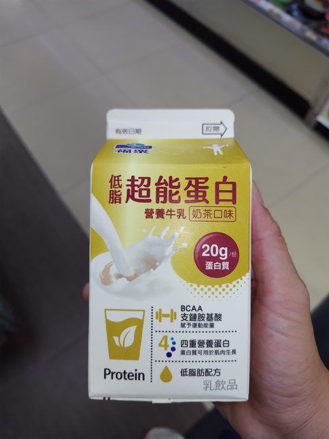 【商品名稱】福樂 低脂超能蛋白營養牛奶(奶茶口味) 【便利商店/廠商名稱】:全家 【規格/內容物/熱量】:375ml/200大卡 【評分】:75 【心得】: 最近減肥都在喝乳清蛋白,喝到快反為了 中午在全家看到包裝類似乳清蛋白的飲品 想說換個口味嘗試一下也不錯 喝起來真的蠻像奶茶的 有點甜,但是對減肥者來說,感覺是小確幸 熱量200卡不算低 但就算是幫自己換個口味調劑一下吧~ 不然快撐不住了QQ https://i.imgur.com/wHgPD1s.jpg