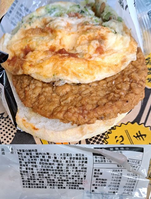 : 我看成分有豬肉,調味跟豬肉起司堡比起來清淡不少沒那麼鹹,上面那片就是口感蠻嫩