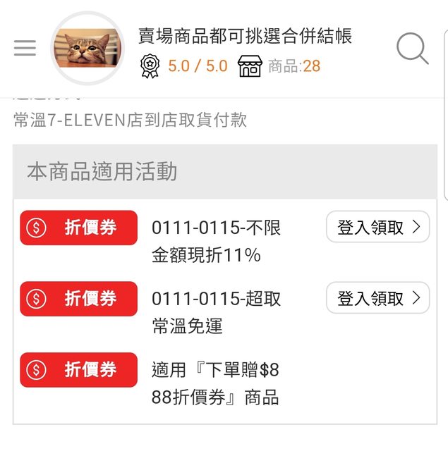 使用7-11 OP會員結帳前領取全站折價券及免運券(折價券使用期限01/11至01/15)