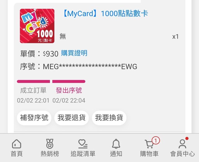 ★【物品名稱】:Mycard點數 1000點