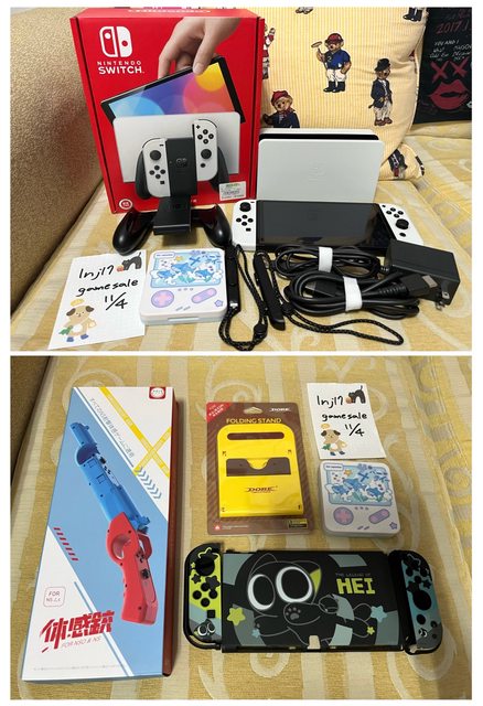 1.Switch oled白,已過保,原廠配件完整,附贈下半圖(體感槍、支架、遊戲片收納盒、?