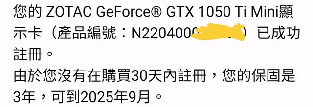 ◎佐證資料:沒在一個月內註冊,詢問原廠後只有三年保固到2025-9月