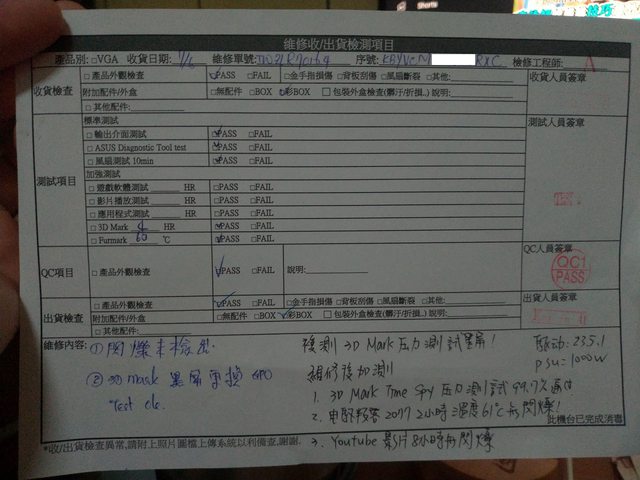 過去曾有閃爍情況,2023/7/6送RMA,華碩維修後(換GPU)測試正常,維修單據一併附上