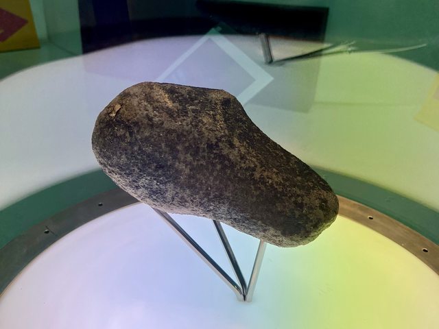 美保關隕石重達6.38公斤,最長徑有25.2公分長。展示廳內有隕石實際大小及重量的模型