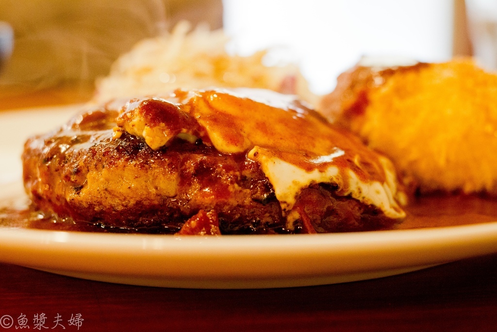 漢堡排並不大塊,約170~200g左右的大小,煎烤時炙出的焦痕有著淡淡的焦香氣息。用筷