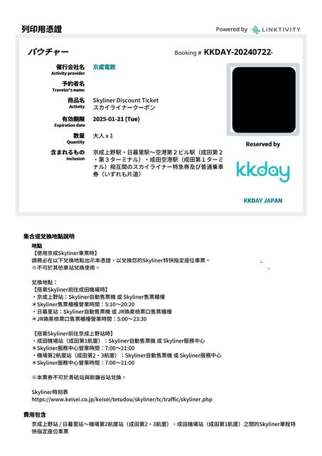 1. 讓售品項:京成SKYLINER回程車票 1張