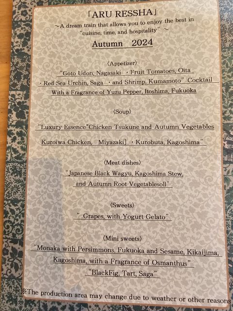 其實本來是想搭36+3去佐世保,結果訂票的時候發現太晚訂,已經沒有包廂了 乾脆把行程改為一直也滿想搭搭看,號稱美食豪華觀光列車的ARU RESSHA去由布院 關於ARU RESSHA的介紹網路上還不少 簡單來說就是 以20世紀的華麗古典為理念所打造,同時能讓乘客享用米其林星級大廚料理的 豪華觀光列車 ARU RESSHA車廂只有兩節,比較開放的第一節跟較注重隱私的第二節 第一節車廂的風格比較奢華,開放感很強
