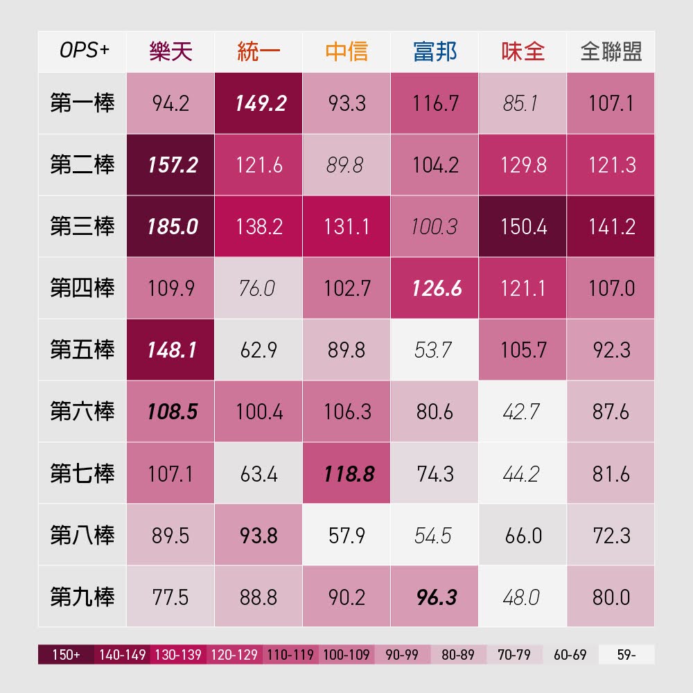 標題: [分享] CPBL 下半季 五隊各棒次OPS+ (~10/11)