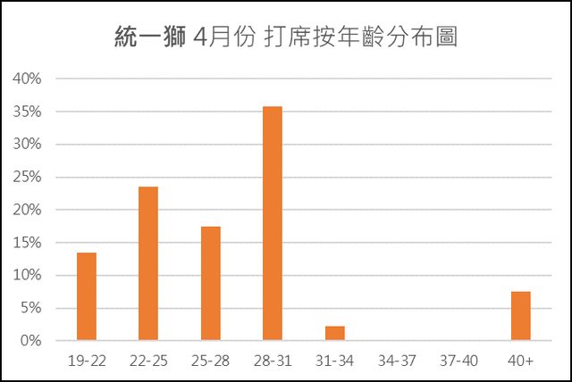們還是可以看出樂天有著最多30歲以上的球員打席(30.2%),包括了朱育賢(33歲)、林泓育(