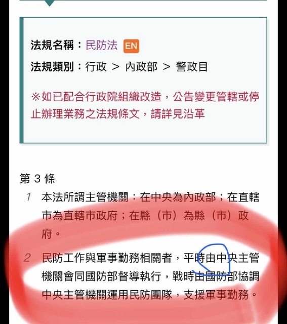 噓 h80733 : 民防法不熟嗎? 民防工作與軍事勤務相關者,平時由 11/22 21:43