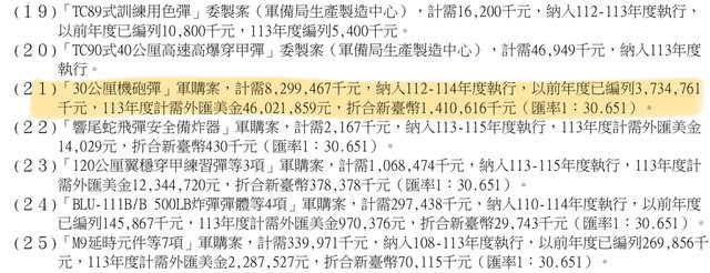 ※ 引述 《chyx741021》 之銘言: : https://bit.ly/3pqA4Dz : 各種非機密的30mm彈藥, : 包括30mm高爆燃燒曳光彈、30mm多用途彈和30mm訓練彈, : 以及工程技術服務與其他技術服務 : 估計總費用為3.322億美元。 : 另外還特別提及能夠增強CM34裝甲車應對現有和未來威脅的能力 今天另一項軍購案決標公告 https://bit.ly/3uFsFCu 品項名稱:高爆彈等3項 得標廠商:A. I. T. 決標金額:94億7130萬9660元 履約起迄日期:112/11/14 - 118/12/31 (預估) 30×173mm彈藥就買了近百億… 國防部預算書有一項「30公厘機砲彈」軍購案 https://i.imgur.com/r84mg9g.png