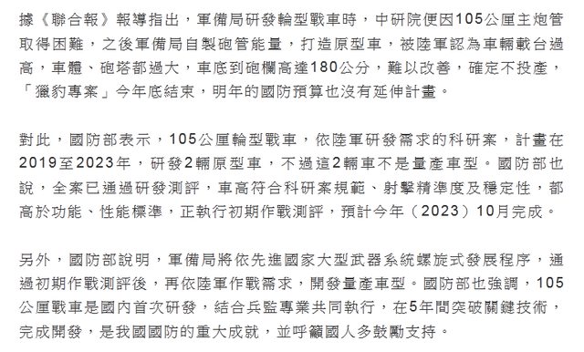 原文來源: https://udn.com/news/story/10930/7630625 原文摘要: 2023-12-10 10:02 聯合報/ 記者 洪哲政 /台北即時報導 國防部軍備局耗資7億元預算執行獵豹案,研發兩輛105公厘砲輪型戰車,在陸軍採用改良 延壽M60A3戰車搭配對美採購M-1A2T戰車下,決定不再投資軍備局研發第三輛樣車,也不 再評估建案採購部署。 據了解,目前獵豹輪型戰車唯一還有的機會,可能比照共軍現役ZTL-11型裝甲突擊砲車, 改用配備水中推進器,具有泛水浮游的能力底盤,爭取換裝我國海軍陸戰隊現有100輛 M60A3戰車,以滿足陸上機動打擊、跨區快速應援,與兩棲登陸規復作戰等多重需求。 軍備局研發輪型戰車之初,中科院曾遭遇105公厘低壓砲取得困難,中科院招標前,已有 國內廠商先透過美國公關公司洽商美方合作意願,但美方早已停產105砲,引發採購爭議 ,雙方鬧上法庭,至於採購105砲前,為何已有特定廠商先行洽談美方意願,是否有內情 ,中科院始終未有具體說明。 軍備局宣稱我方已有自製低壓砲能量,兩輛原型車D1、D2,陸軍裝訓部對於車輛載台過高 ,車體與砲塔過大,車底到砲欄高達180公分,無法改善,確定不投產,獵豹專案年底斷 炊,軍備局仍希望研製第三輛改良型樣車。 據指出,陸軍採購M-1A2T戰車,2024年接裝38輛,2025年42輛,2026年28輛,合計108輛 。未來在地區指揮部、聯兵旅架構下,以戰車連為單位,分散部署北部聯兵旅,鄰近高速 公路林口交流道的金龍營區、待整建的大崗營區、北五堵營區與淡水營區等。 輪型戰車研發案因陸軍以M-1A2T戰車,搭配現有M60A3延壽計畫下,確定不建案採購。 心得感想: 國防布6月說法是今年(2023)10月完成初期作戰測評,看來還是被放生了。 https://i.imgur.com/bXu2KP0.png