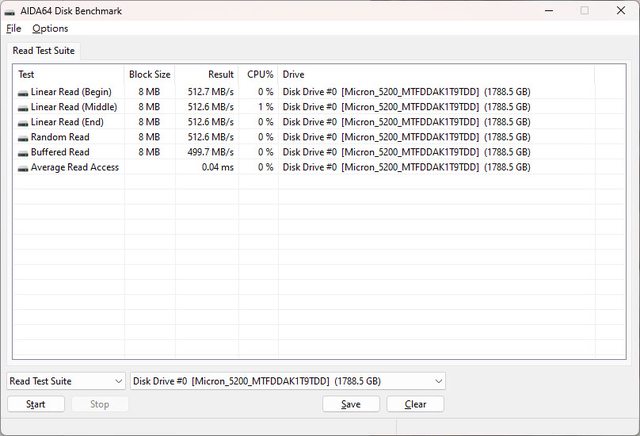 ▼Micron 5200 PRO SATA3 1.92TB SSD的AIDA64 Disk Benchmark讀取測試