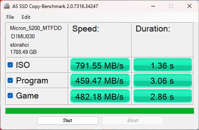 ▼Micron 5200 PRO SATA3 1.92TB SSD的AS SSD Copy-Benchmark傳輸速度測試