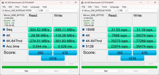 ▼Micron 5200 PRO SATA3 1.92TB SSD的AS SSD Benchmark測試