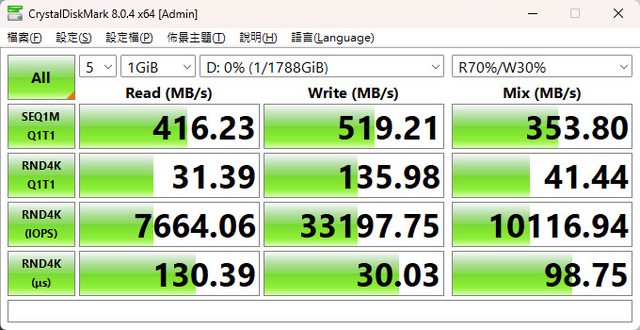 ▼Micron 5200 PRO SATA3 1.92TB SSD的CrystalDiskMark真實世界效能+Mix(R70%/W30%)