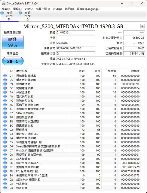 ,已經通電36次,累積時間38894小時,寫入量96500GB