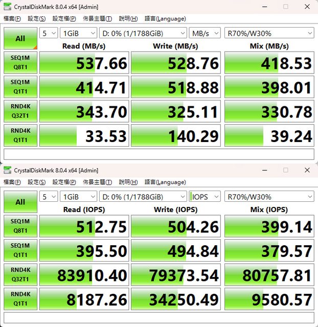▼Micron 5200 PRO SATA3 1.92TB SSD的CrystalDiskMark預設+Mix(R70%/W30%)傳輸速度
