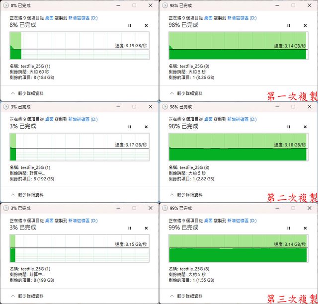次,第1至3次寫入狀況如下圖,均維持在3.14至3.19GB/s的速度