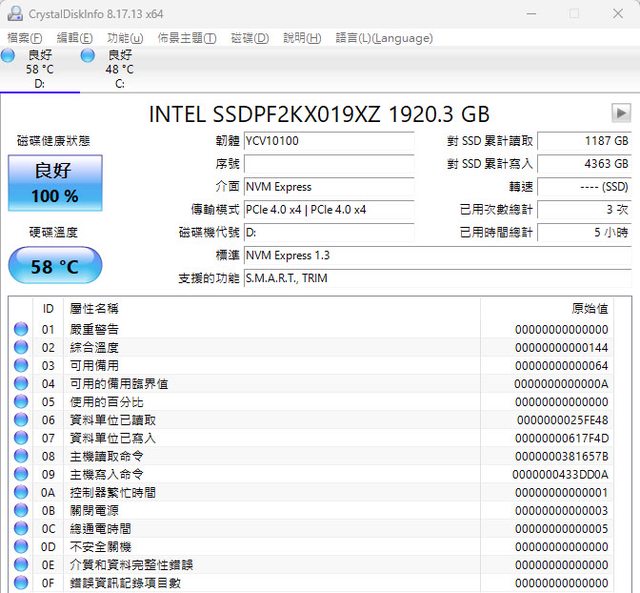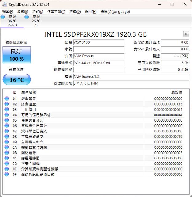 ▼Intel D5-P5530 U.2 Gen4 NVMe 1.92TB SSD的CrystalDiskInfo資訊內容