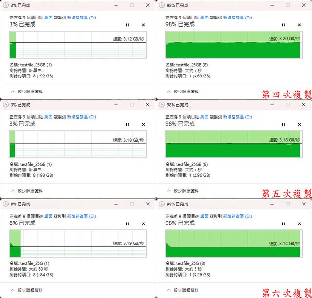▼第4至6次寫入狀況如下圖,均維持在3.12至3.2GB/s的速度