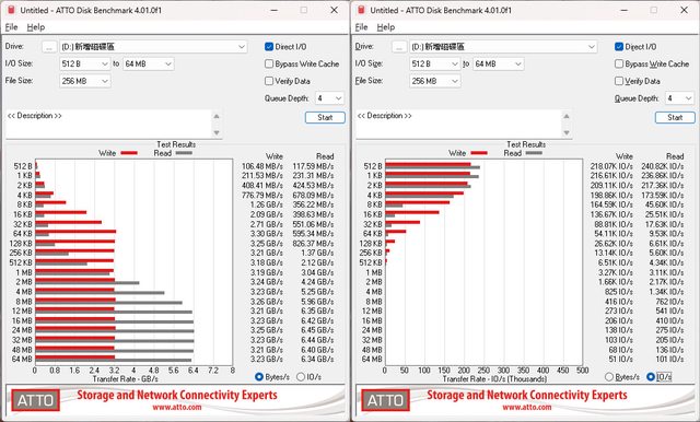 ▼Intel D5-P5530 U.2 Gen4 NVMe 1.92TB SSD的ATTO Disk Benchmark傳輸速度測試