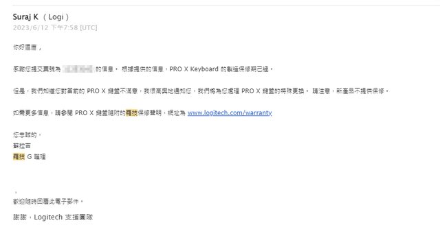 中間傳來的Email說我的鍵盤是過保固沒有錯,但是我不滿意我的鍵盤
