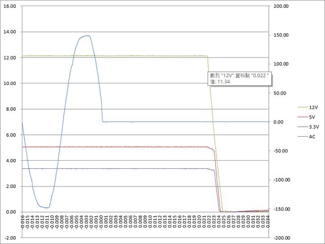 ○綜合全負載輸出狀態切斷AC輸入模擬電力中斷,12V於22ms降至11.34V