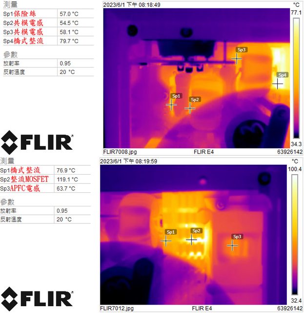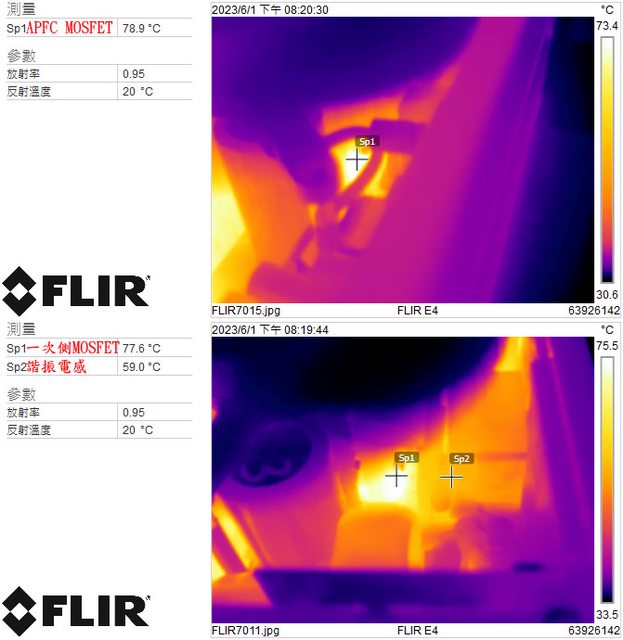 ▼電源供應器滿載輸出下APFC MOSFET(上圖)及一次側MOSFET/諧振電感(下圖)的紅外線熱