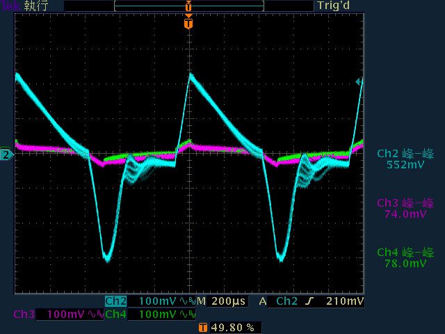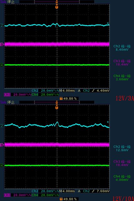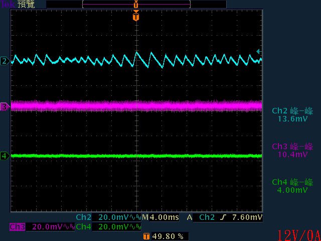 ○輸出無負載時有12V有鋸齒狀漣波;輸出12V/10A以上12漣波波形固定,只改變振幅。於
