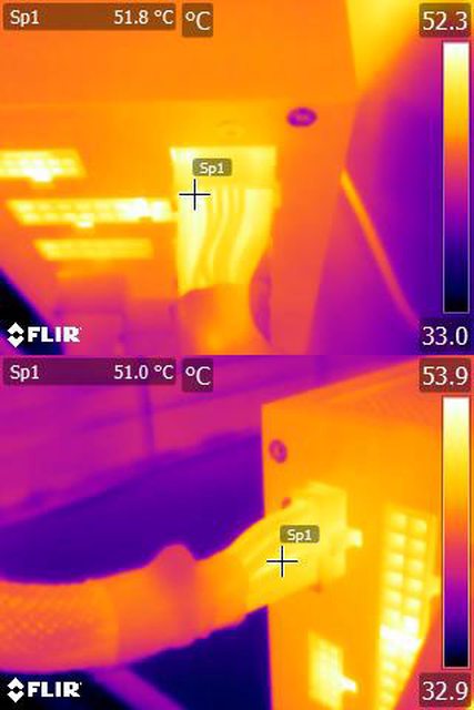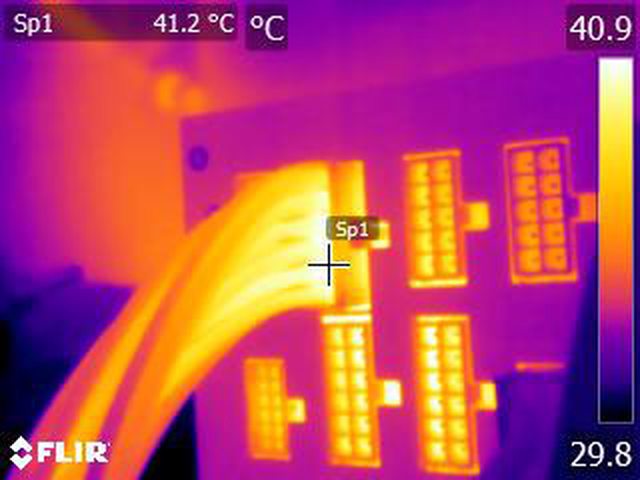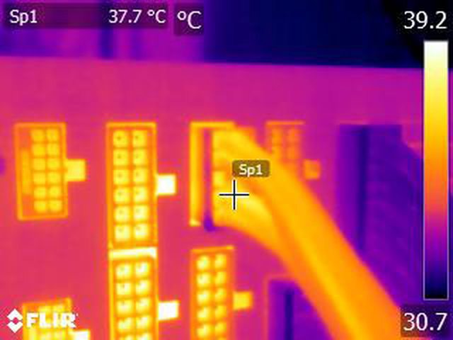 ▼執行FURMARK 30分鐘後電源端插頭的紅外線熱影像圖(附註:安裝位置環境溫度會影響
