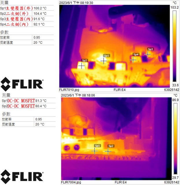 ▼電源供應器滿載輸出下主變壓器/二次側(上圖)及DC-DC MOSFET(下圖)的紅外線熱影像