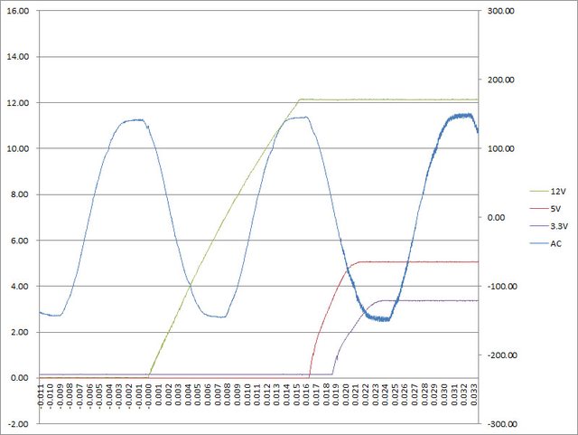 ○電源啟動至綜合全負載輸出狀態,12V上升時間15ms,5V上升時間5ms,3.3V上升時間