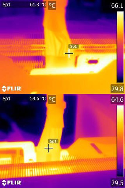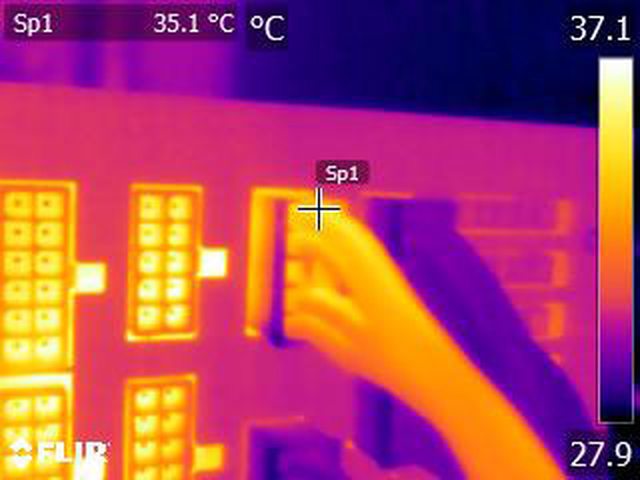 ▼執行FURMARK 30分鐘後顯示卡端插頭的紅外線熱影像圖(附註:安裝位置環境溫度會影
