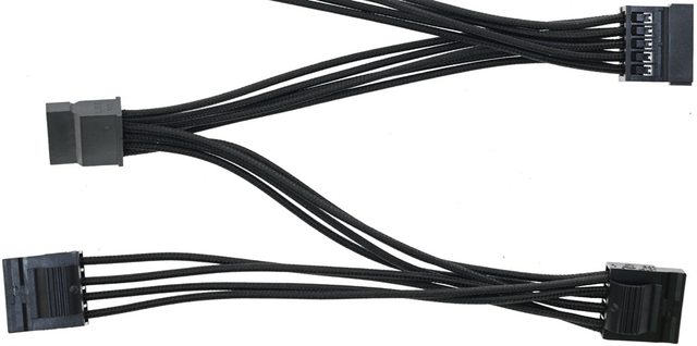 ▼1條SATA接頭及大4P接頭黑色傘繩編織線模組化線路,提供2個直式SATA接頭及2個省力