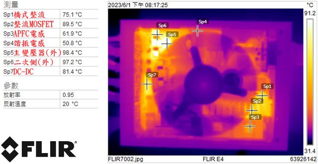 ▼電源供應器滿載輸出下內部的紅外線熱影像圖(附註:安裝位置環境溫度會影響測試結