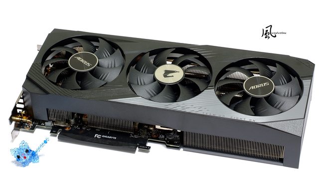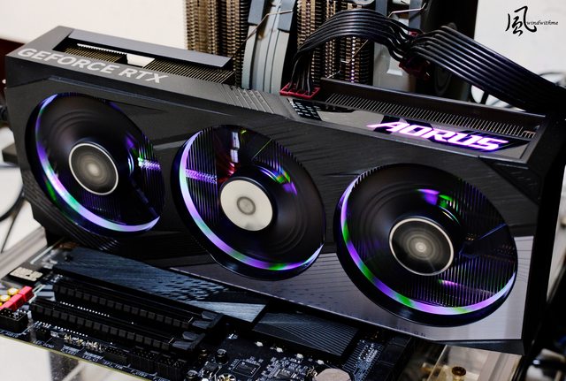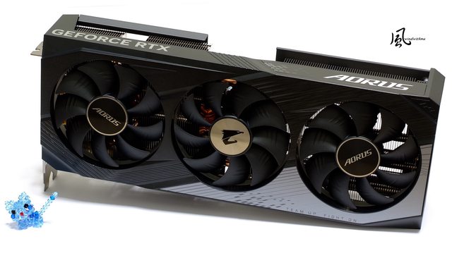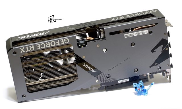 右方採用延伸風道設計提升散熱能力,中央與右下側邊AORUS皆為燈號設計。